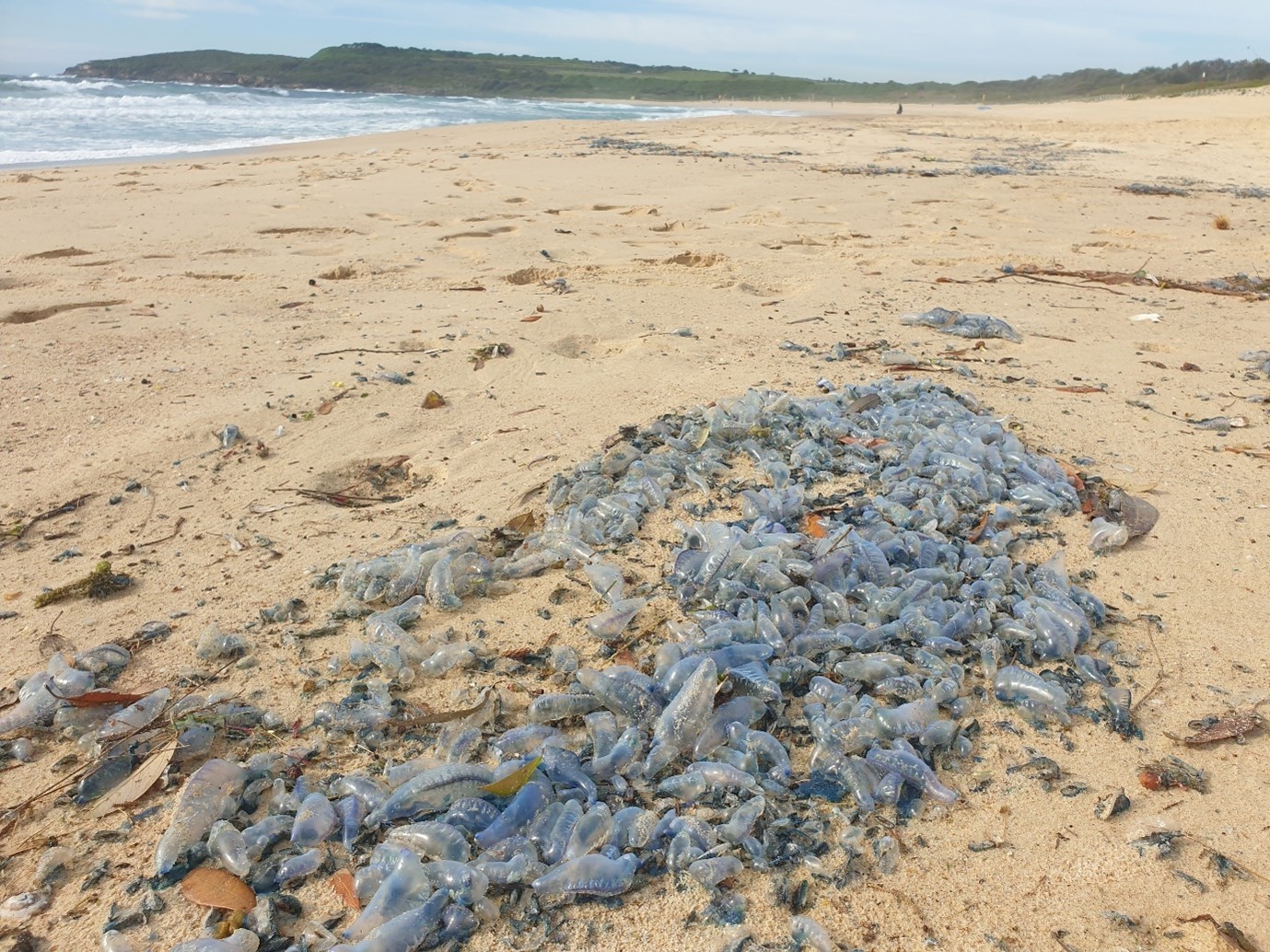 An armada of bluebottles beached at the high tide mark (Dr Amandine Schaeffer, UNSW, Maroubra Beach)