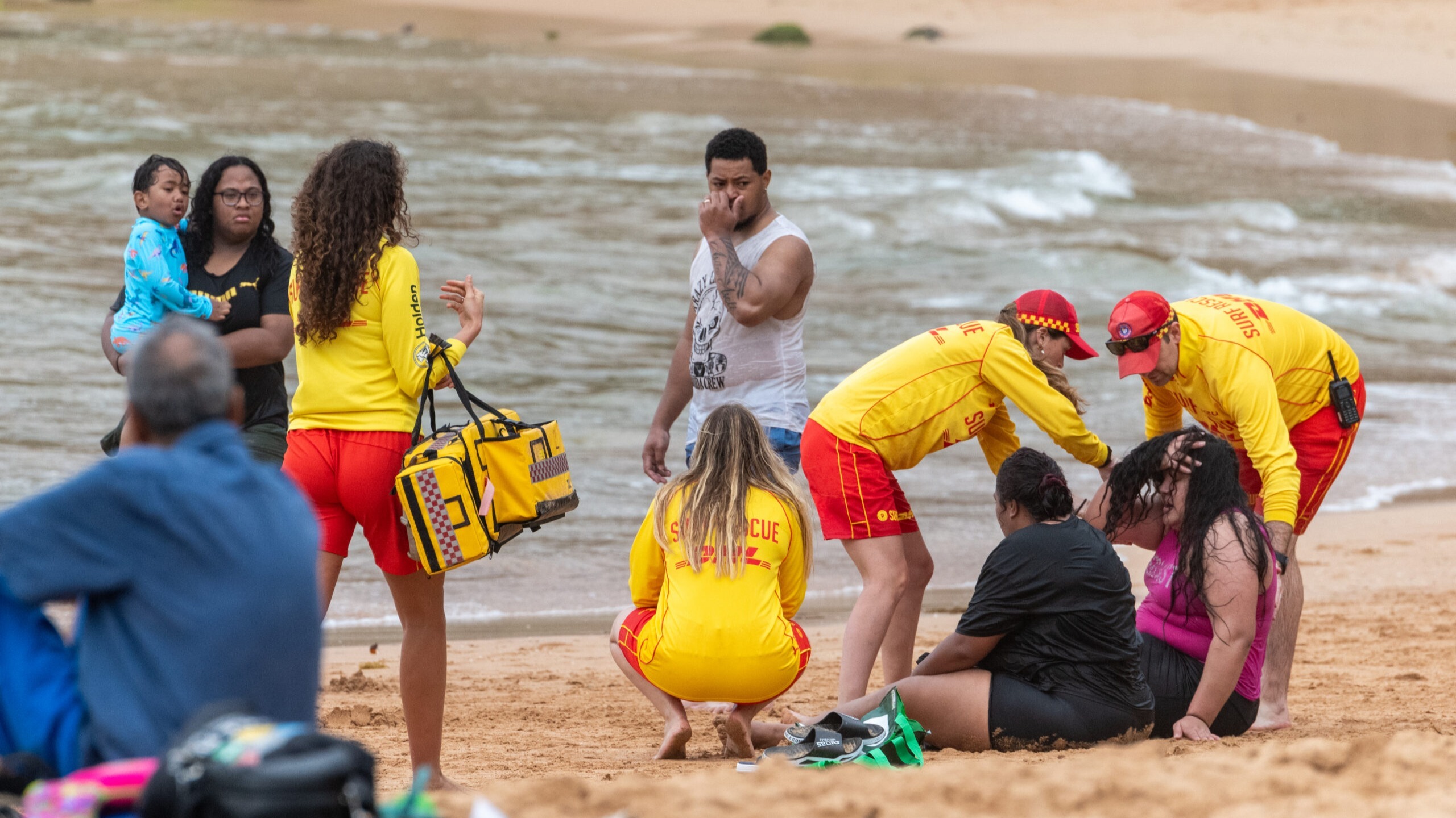 One moment the swimmers had been having fun, laughing and enjoying themselves between the red and yellow flags. Suddenly, a rogue wave dragged them beyond the sandbank. Gasping for air and unable to fight the current, the terrified group were quickly out of their depth and struggling to stay afloat.